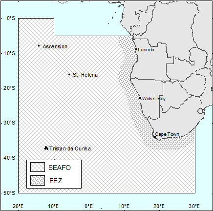beginning at the outer limit of waters under national jurisdiction at a point 6º South, thence due west along the 6º South parallel to the meridian 10º West, thence due north along the 10º West meridian to the equator, thence due west along the equator to the meridian 20º West, thence due south along the 20º West meridian to a parallel 50º South, thence due east along the 50º South parallel to the meridian 30º East, thence due north along the 30º East meridian to the coast of the African continent.