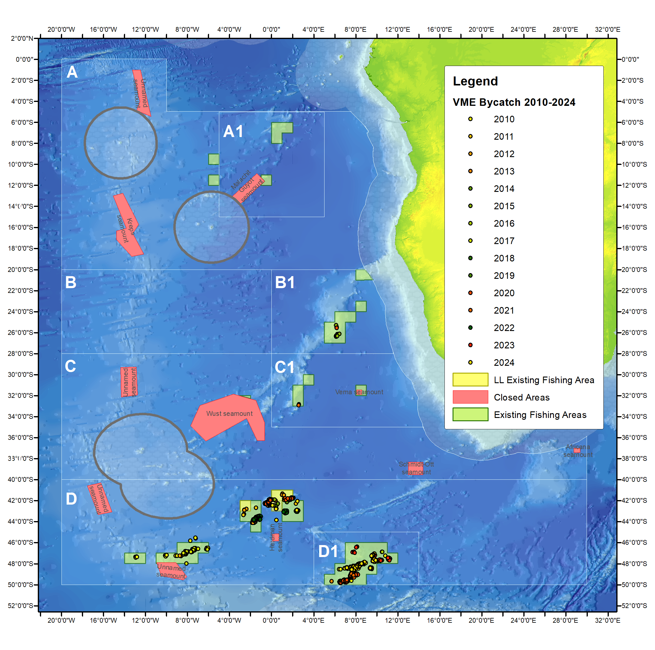 SEAFO scientific observers are required to record all locations where VME indicator species are caught. To date, no vessel has encountered by-catch above the thresholds.